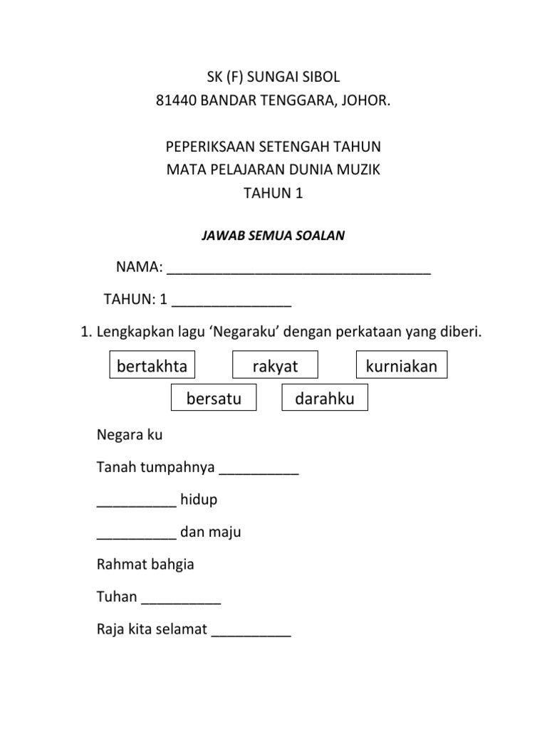 Ejercicio De Pentaksiran Pertengahan Tahun 2021 Pend Muzik Tahun 6